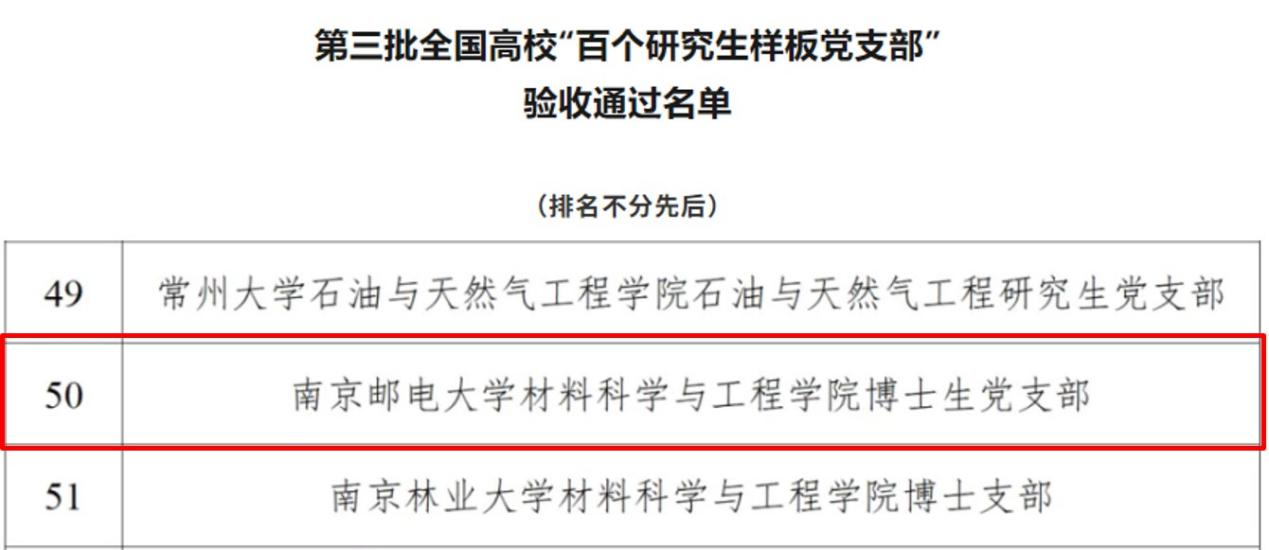 近日,教育部思想政治工作司公布了第三批全国高校“百个研究生样板党支部”和“百名研究生党员标兵”创建培育工作验收通过名单。通过创建培育,经高校评估总结、省级党委教育工作部门把关审核、教育部学位与研究生教育发展中心审查及相关司局综合评定,认定南京邮电大学材料科学与工程学院博士生党支部通过第三批全国高校“百个研究生样板党支部”创建培育验收。