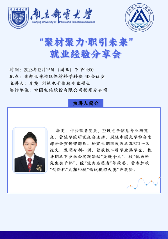 为积极应对当前就业形势,助力研究生精准规划职业发展、提升求职竞争力,2025年12月19日下午,材料科学与工程学院在材料学科楼412会议室开展“聚材聚力,职引未来” 研究生就业经验分享交流会。本次分享会由学院红柚驿站辅导员工作室邀请电子信息专业2023级研究生李雯同学担任主讲人。