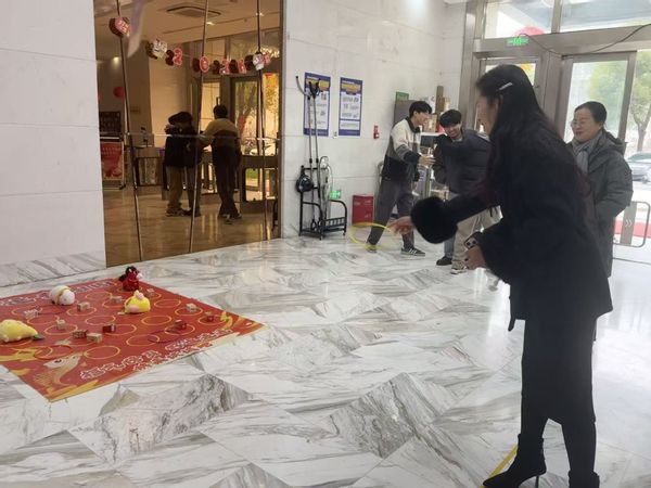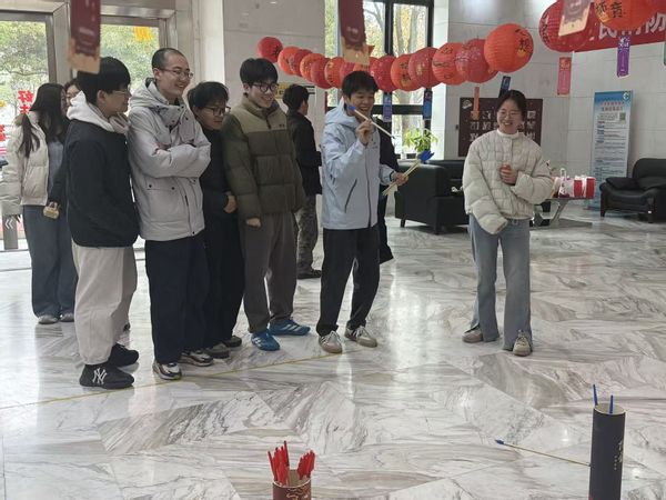 在互动游戏区,人头攒动,热闹非凡。“猜灯谜”“投壶”“套圈”等极具传统特色的趣味游戏吸引了众多同学驻足参与。大红灯笼下,同学们三五成群,沉浸在猜灯谜的智慧交锋中,感受着传统文化的深厚底蕴;投壶游戏前排起了长龙,每当箭矢稳稳入壶,便引来阵阵热烈的喝彩;满载惊喜的套圈游戏则将现场气氛推向高潮,大家各显身手,小小的圆圈不仅套中了心仪的奖品,更圈住了大家对新学期好运与幸福的美好期盼。