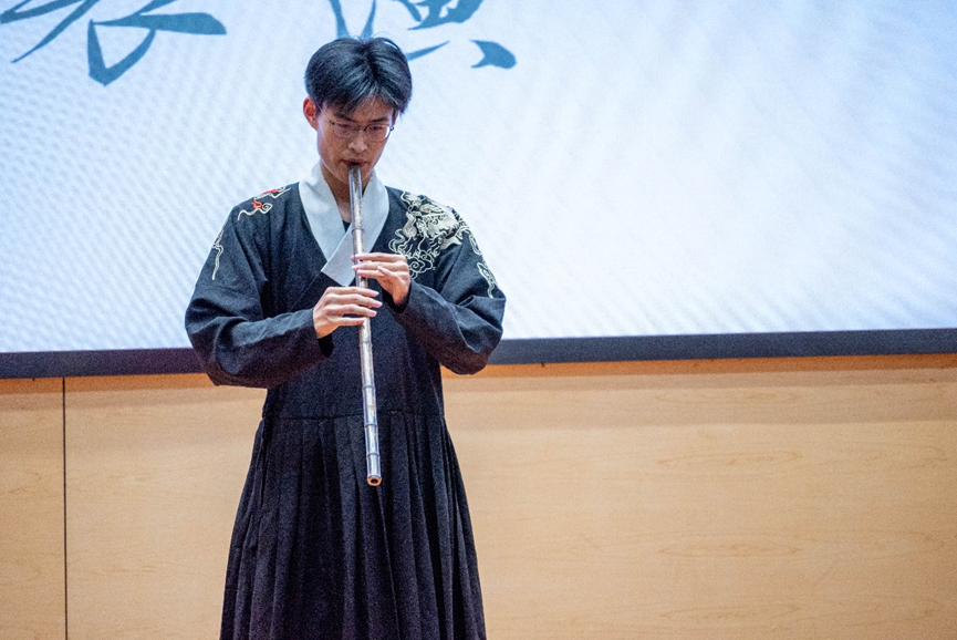 在紧张激烈的比赛间隙,古琴社、相声社、古风社的精彩表演为现场增添了一抹别样的雅韵。古琴社的路向东同学带来一曲《兰亭序》,让观众仿佛穿越时空,置身于古代的兰亭雅集之中,感受着笛声的独特魅力。七醉阁古风社的赵博和蔡奕鸣同学带来了精彩的古风表演《人间应又雪》,他们身着华丽的古装,唱尽元白“金石胶漆,未足为喻”的深情,让观众沉醉于古风文化的独特韵味之中。哈哈笑相声社的同学以幽默风趣的语言和生动形象的表演,将诗词与相声巧妙结合,在欢声笑语中传递诗词趣味与知识,让观众在轻松愉快的氛围中领略到诗词的别样风采。
