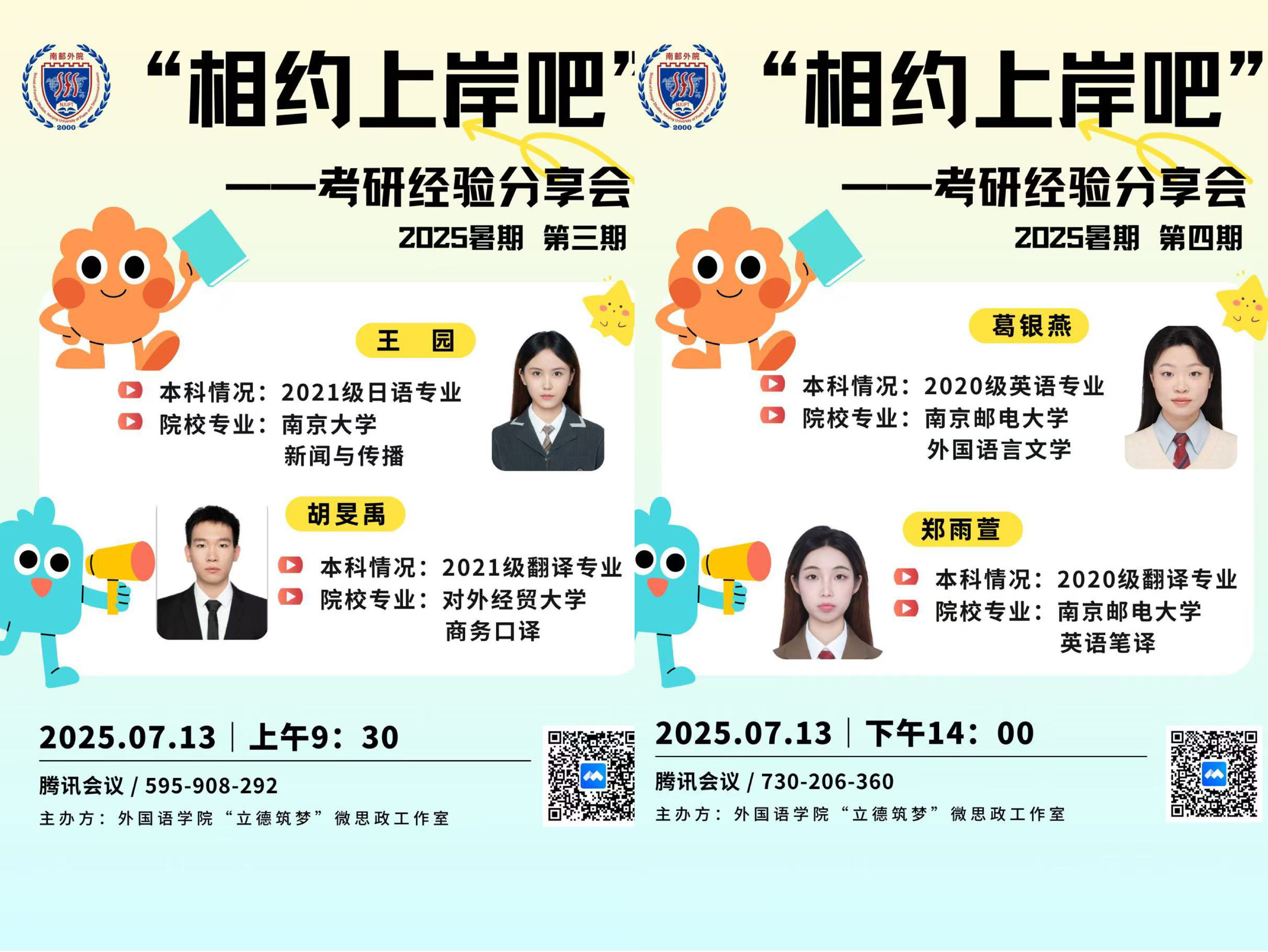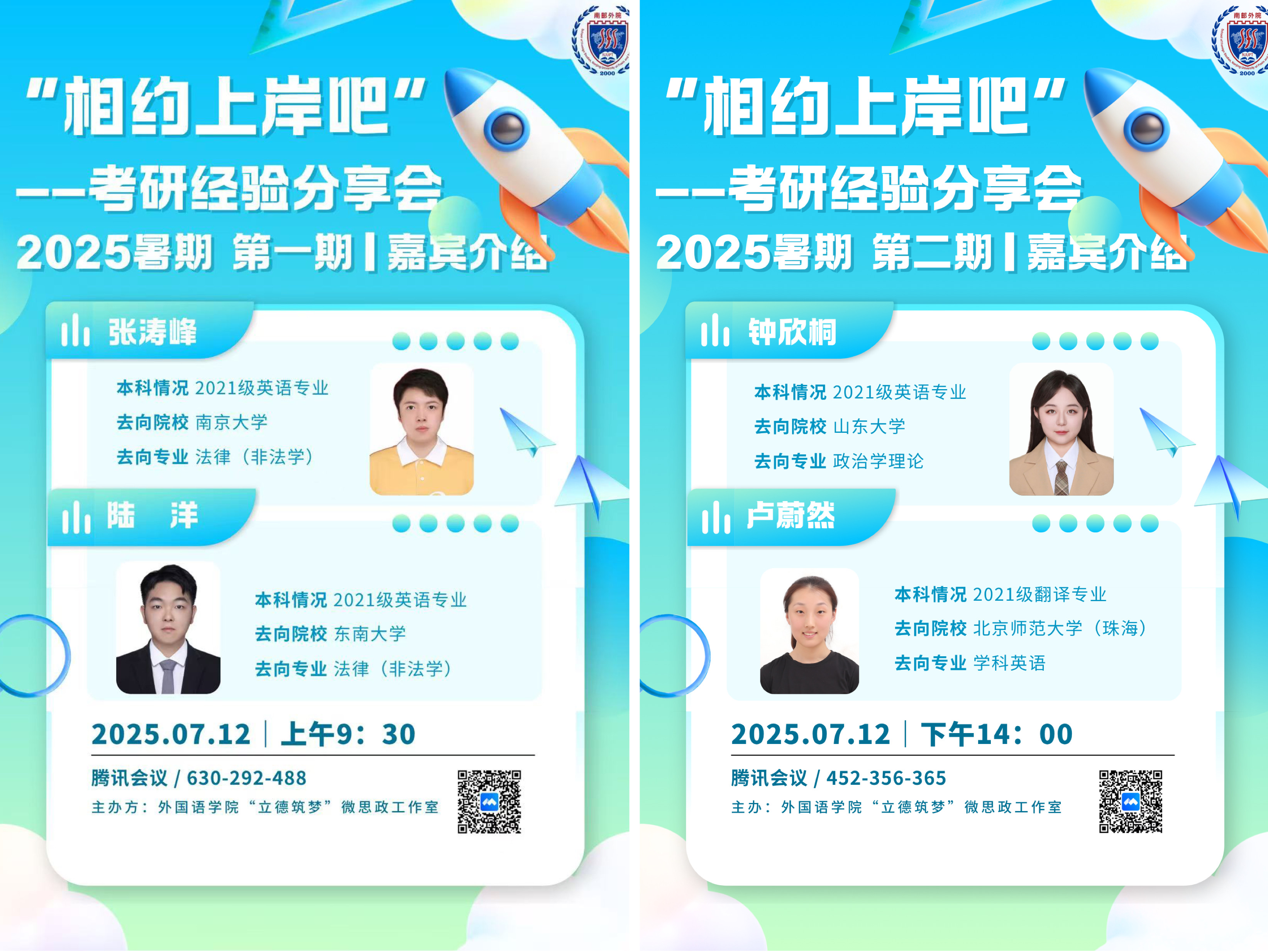 为助力2026届考研学子科学备考、理性择校,外国语学院于7月12日-13日举办4期“相约上岸吧”考研经验分享会。本次活动邀请学院研究生及往届优秀校友为考研学子提供备考指导,活动由学院研究生会学术科创部协助开展。