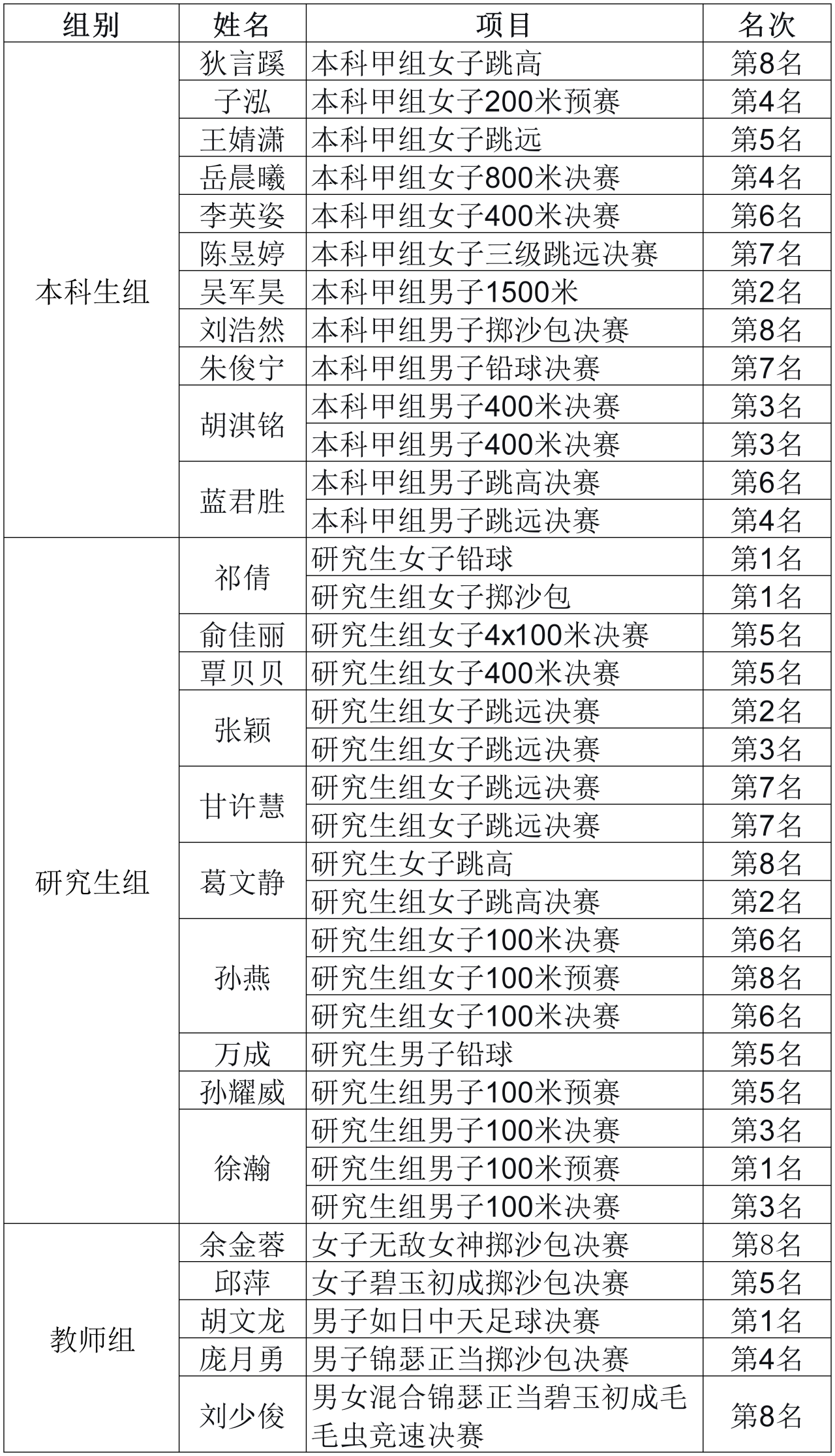 在本次比赛中,我院胡文龙、魏飞老师在男子如日中天双人足球赛中一局夺魁、斩获金牌!研究生女子铅球和女子掷沙包项目中,我院祁倩同学顽强拼搏、摘得两金。在本科生组1500米长跑中,我院吴军昊同学以坚定有力的步伐勇夺亚军;在研究生组百米决赛中,徐瀚同学斩获铜牌一枚。