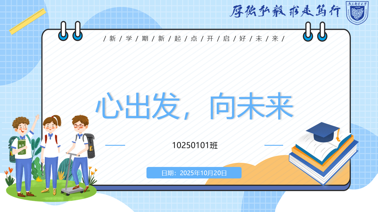 新学期开始,为帮助新生同学们更好地适应大学生活,增强心理素质,南京邮电大学通信与信息工程学院10250101班于2025年10月20日在无线楼1号教室开展以“我的大学,从心出发”为主题的新生心理适应班会。此次班会由班长曹恪凡、团支书江舒馨组织,辅导员胡枫老师及心理中心教师协助开展,10250101班全体同学参与。