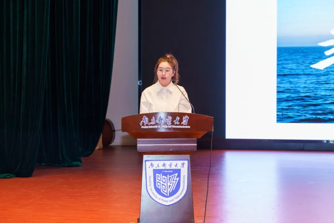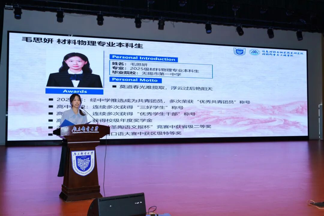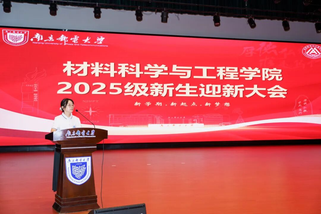 新生代表2025级材料物理专业本科生毛思妍同学怀着激动的心情上台发言。她表达了对大学生活的美好憧憬和期待,分享了自己选择学院和专业的心路历程,并代表全体本科新生承诺,将以饱满的热情、积极的态度投入到学习生活中,遵守校规校纪,努力学习专业知识,积极参加各类活动,在学院这片沃土上努力拼搏,追逐梦想,不负青春韶华。