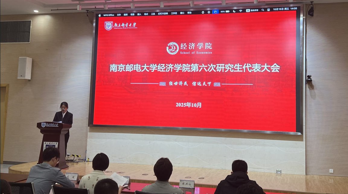 2025年10月15日下午,经济学院第六次研究生代表大会在学科楼中兴报告厅顺利召开。经济学院党委副书记、副院长吴迪,分团委书记尤波,研究生辅导员王珏,研究生辅导员周洪山出席会议,大会由经济学院研究生胡韫希同学主持。
