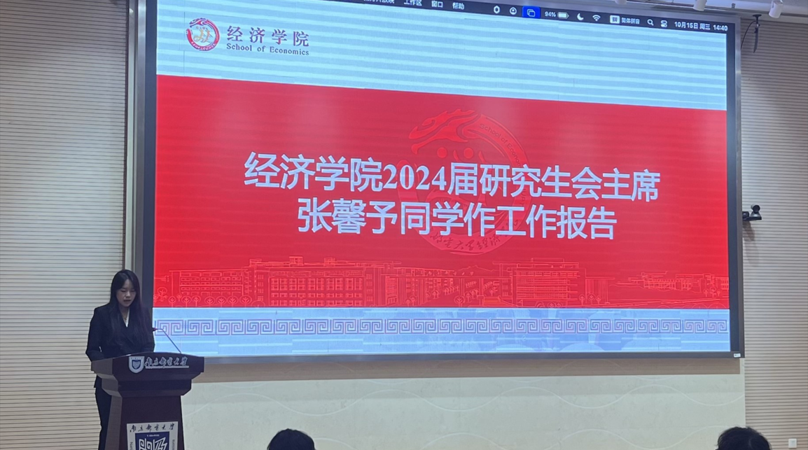 经济学院2024届研究生主席团成员张馨予同学在大会上总结了上一年度学院研究生工作情况。张同学围绕加强思想引领、夯实组织建设、贴近同学需求等方面回顾了过去的研究生会工作情况,同时还对下一阶段的研究生工作提出了目标和计划。研究生会会更加积极响应号召,服务学院发展大局,更好地代表、服务和团结广大同学,着力建设广大同学想得起、找得到、靠得住、离不开的学生组织,为学院发展贡献青年学子的力量。