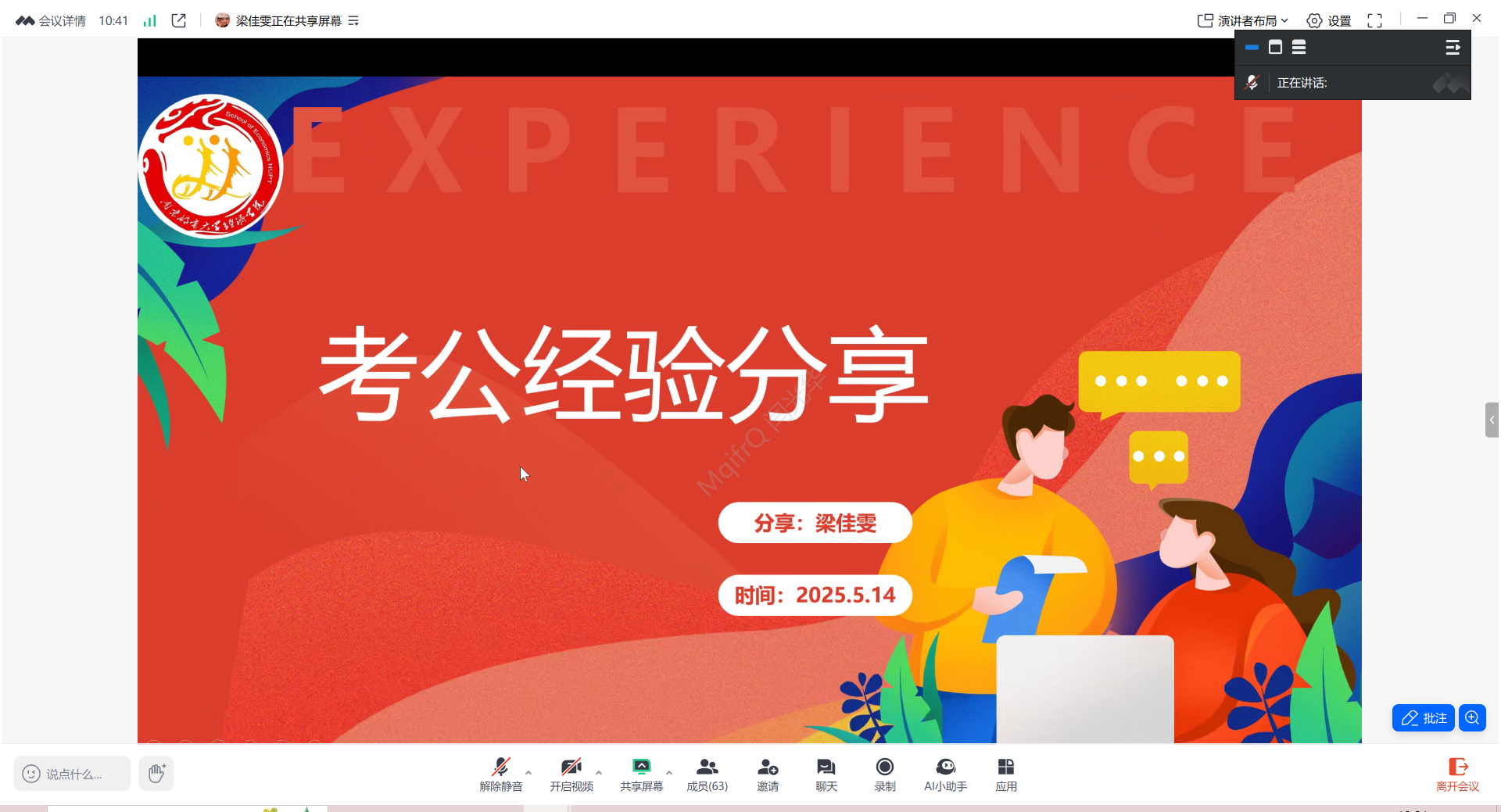 为帮助我院研究生更好了解考公方面的相关情况,提前为自己的职业规划做好准备,2025年5月14日晚,经济学院研究生会与研究生党支部共同组织开展了“我为同学做实事系列活动”——考公经验分享会。本次在线分享会邀请到张辰月和梁佳雯两位学姐。