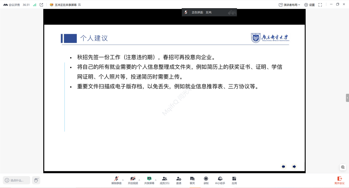 分享环节中,李慧媛学姐与王冲学长首先结合当下行业发展趋势,深度解读了就业市场的需求导向与竞争格局,帮助研一研二同学构建起对整体就业环境的全面认知。随后,他们围绕实习就业的核心环节展开干货分享。简历制作方面,着重强调要精准凸显个人专业优势与核心竞争力;简历投递方面,倾囊相授了信息筛选、投递时间选择等实用小技巧;面试技巧方面,详细拆解了不同类型企业的面试流程与应答逻辑;职业规划方面,建议同学们立足自身优势,明确发展路径,提前做好实习实践积累与行业知识储备。