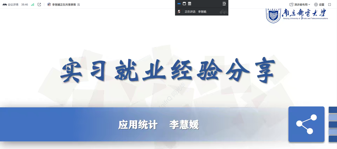 2025年6月11日晚,经济学院研究生顺利开展了“我为同学做实事”系列活动——实习就业经验分享会。本次分享会通过线上进行,邀请到应用统计专业的李慧媛学姐与应用经济专业的王冲学长分享自己的实习求职经历,旨在让我院研一研二同学收获实用经验、明晰发展方向。